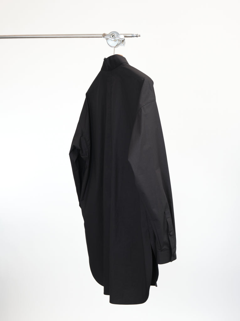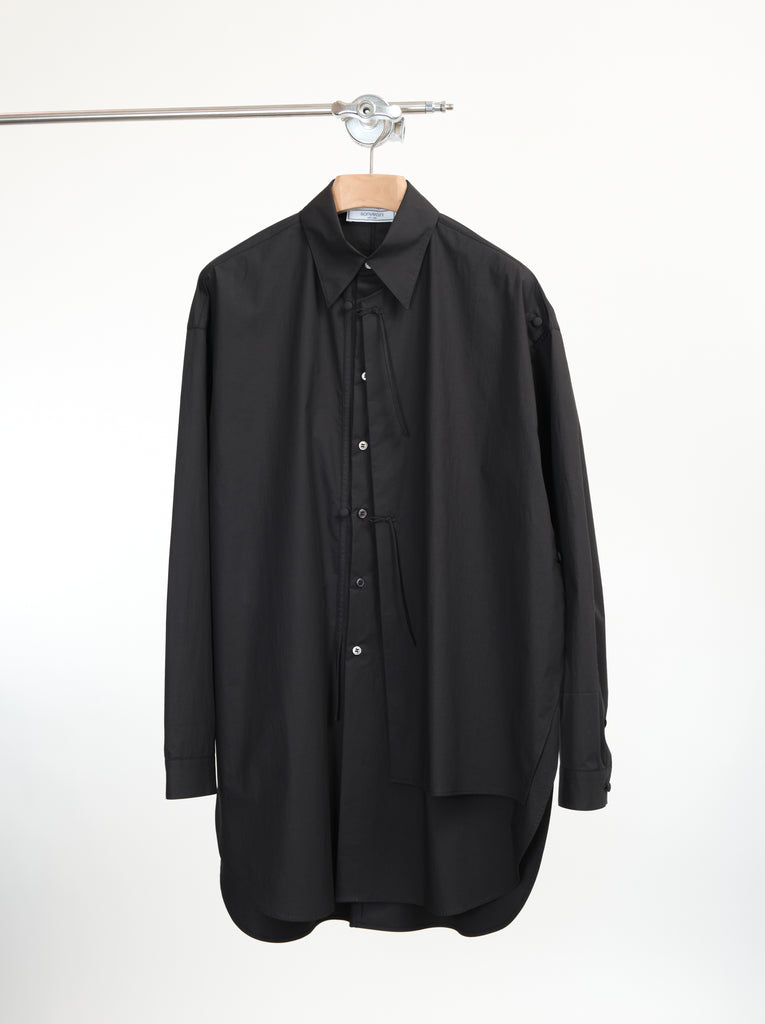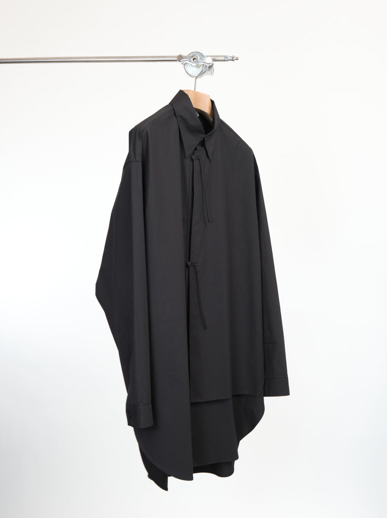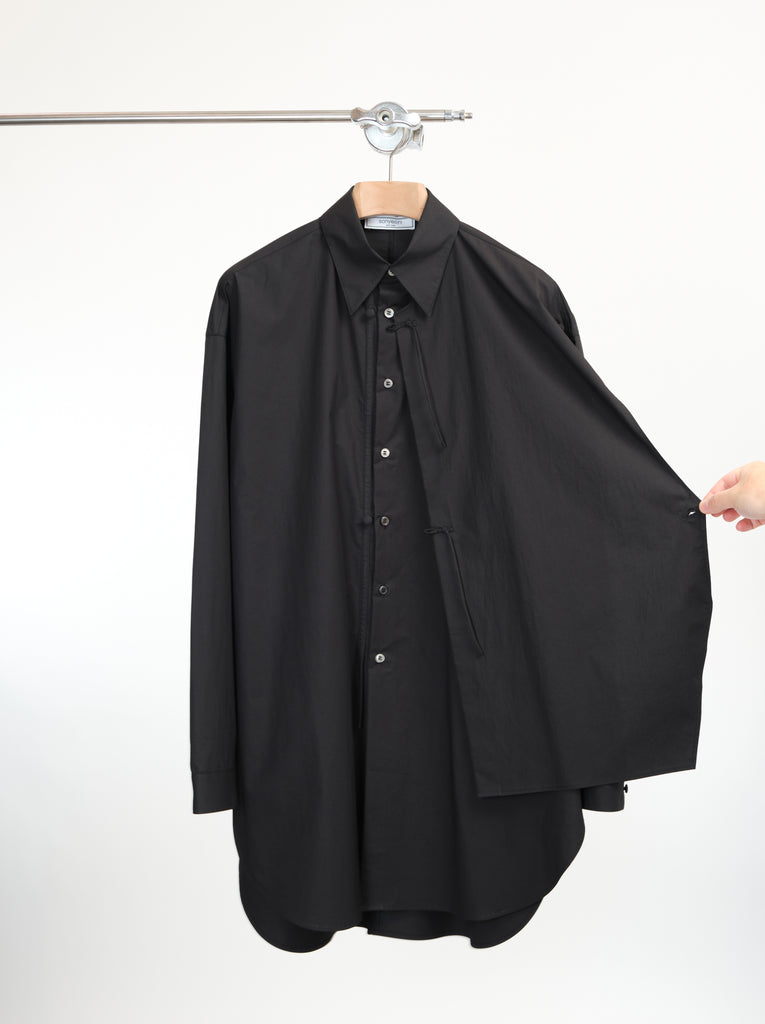 A boxy silhouette shirt in beautiful and crispe looking cotton fabric sourced from Japan. The shape and the detail inspired from korean traditional costume. Front right side is double layered.