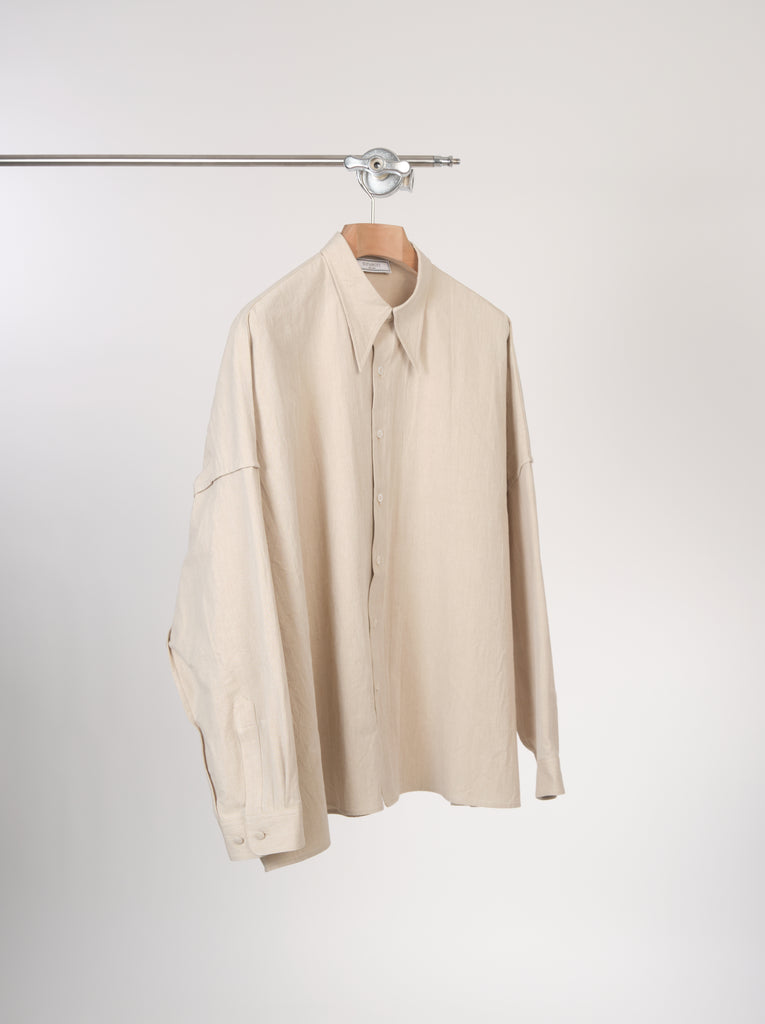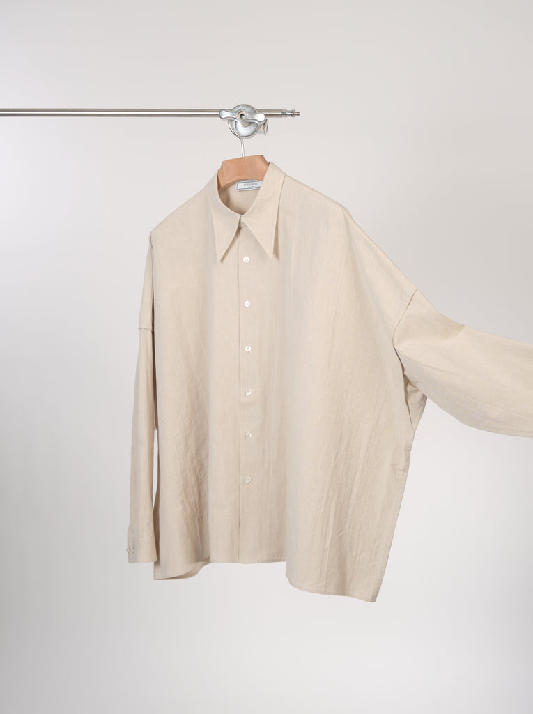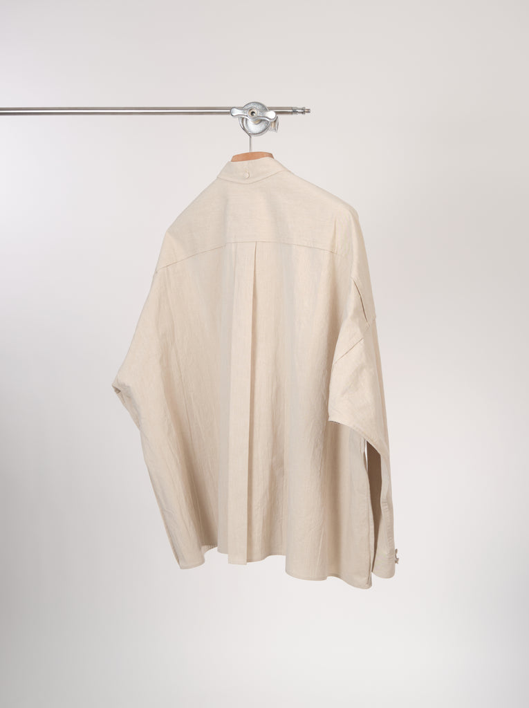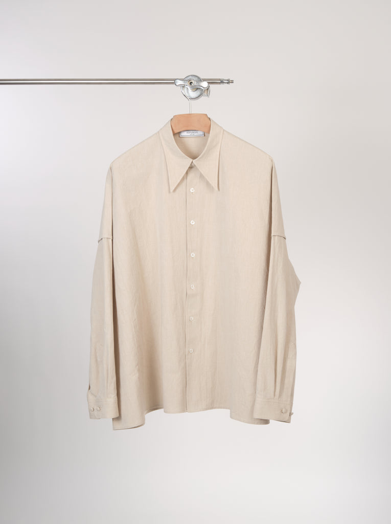 Exaggerated boxy silhouette shirt in beautiful and crispe looking cotton and japanese paper blended fabric sourced from Japan. It has naturally crinkled surface and light weight to it.